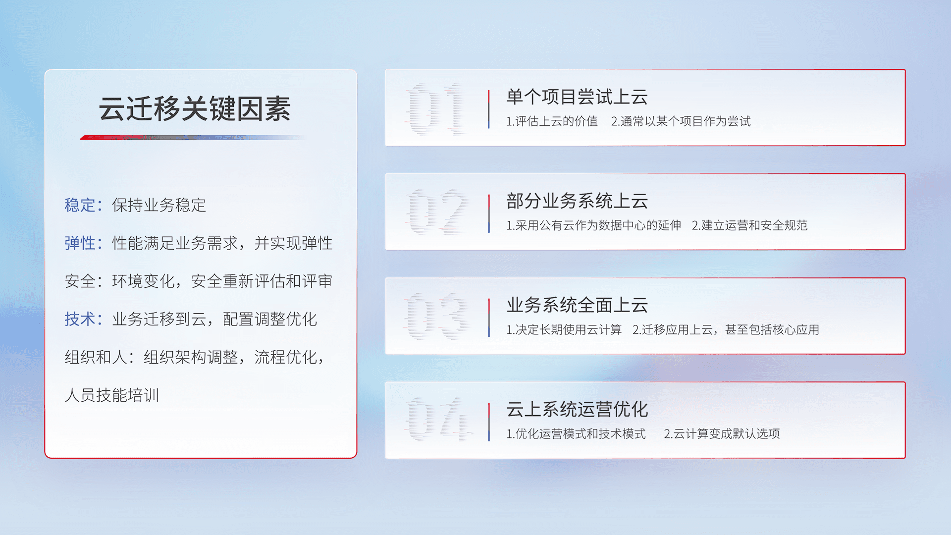 结合实际业务,,,,从规划设计、、、云平台选型、、、云原生改造、、数据迁移、、集成交付,,,,迁移全过程为客户识别最佳上云路径,,,,做好风险识别管理,,设计网络架构、、、、身份权限、、安全审计合规、、、操作审计、、、日志审计、、、监控告警策略、、多站点容灾设计等,,,,对云上基础设施进行整体规划,,,,提升IT治理水平,,,以满足弹性、、、高可用、、、、高性能的需求。。。