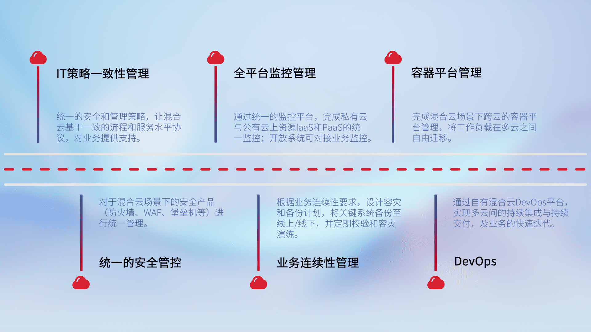 通过多云纳管,,以统一的资源数据模型把客户的云资源进行抽象和封装,,,,进而实现对多云资源的统一操作,,,,保障云资源管理的可靠性、、、稳定性与可用性。。。。量身定制化运维内容,,,,配置、、、开发运维、、、、补丁管理、、备份、、、、监控、、、认证和访问管理、、审计和日常巡检等,,,,保障在用云过程中的可靠度,,,稳定度以及高可用率。。。。
